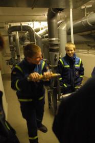 Herr Janick führte uns im Inneren auch die Luftversorgung vor, die von außen mit Strom betrieben wird. Da es keine eigene Stromversorgung für den Bunker gibt, können die Pumpen für die Luft auch über Kurbeln per Hand betrieben werden, was schnell in schweißtreibende Arbeit ausartet, welches zwei unserer Junghelfer am eigenen Leib erfuhren, da sie es selbst ausprobieren durften.