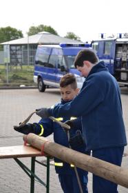 Nach der ersten Nacht, THW-typisch in der Fahrzeughalle des OV auf Feldbetten verbracht, stand der Samstag unter dem Vorzeichen verschiedener Ausbildungsthemen der THW-Jugend. Aufgeteilt in zwei Gruppen, übten die Junghelfer Stiche und Bunde bzw. das Bewegen von Lasten mit dem Hebekissen. Dabei wurde nicht nur das Heck eines GKW angehoben, sondern auch eine Bank, auf der eine Pyramide von bis an den Rand mit Wasser gefüllten Bechern aufgebaut wurde. Hier ging es darum, so vorsichtig und vor allem gleichmäßig wie möglich die unter den beiden Seiten der Bank liegenden Hebekissen zu befüllen.