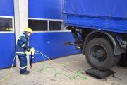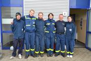 Am Nachmittag standen zwei weitere Ausbildungsthemen auf dem Plan: das Ausleuchten einer Einsatzstelle sowie das Retten von verletzten Personen. Rettungssanitäter Armin erklärte, wie man eine bewusstlose Person vorsichtig auf die Möglichkeit einer Wirbelsäulenverletzung abtastet und sie auch aus der Bauchlage heraus in die stabile Seitenlage bringen kann. Auch die korrekte Handhabung des Schleifkorbs als Rettungsmittel und das Heben der verletzten Person zu dritt in den Korb wurden ausführlich erklärt und geübt.