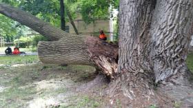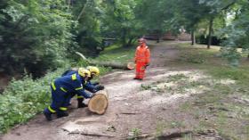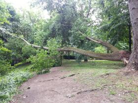 Im Rahmen unseres regelmäßigen Bereitschaftsdienstes mit der Berliner Feuerwehr erhielten wir am 20.6.2015 den Auftrag, eine “kleine Technische Hilfeleistung” im Stadtteil Friedrichsfelde durchzuführen. Diese offenbarte sich den Helferinnen und Helfern bei deren Eintreffen als eine etwa 35 Meter hohe Linde, von welcher ein Ast ähnlicher Länge und einem Durchmesser von mehr als einem Meter abgeknickt war. Dieser war quer über einen Bach gefallen, hatte sich in mehreren Baumkronen verfangen und drohte auf den Fußgängerweg zu stürzen.