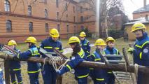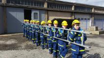 Anschließend ging es über zum praktischen Teil auf dem Hof. Auf dem Tagesplan stand das Thema Leitern. Nicht nur das Aufstellen und der Transport wurde geübt, sondern auch das Sichern durch eine Kopf- und Fußpunktsicherung. Jeder konnte seine Höhentauglichkeit testen und die frische Luft genießen. In einer Teamarbeit sollten die Junghelferinnen und Junghelfer bei dem Transport einer Steckleiter unter Hindernissen getestet werden. Nach erfolgreichen Rückbau ging es zurück zur Unterkunft. Oben angekommen wurden Erste Hilfe Maßnahmen und das Absetzen eines Notrufes geprobt. Nach einem erfolgreichen und aufregenden Dienst ging es dann verdient in den Feierabend.