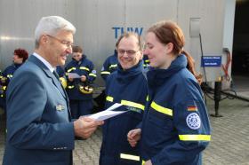 Nach Auswertung der Prüfungsbögen übergab der Berliner Geschäftsführer des THW die Zertifikate. Mit Abschluss der Grundausbildungsprüfung haben die Ehrenamtlichen nun die Berechtigung erlangt, an THW-Einsätzen teilnehmen.