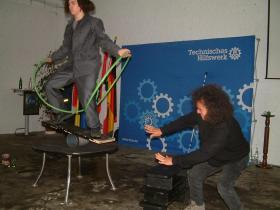 Berlin Friedrichshain-Kreuzberg. Auf turbulente Anfangszeiten blicken sie beide zurück: Der THW-Ortsverband Friedrichhain-Kreuzberg und der Kinder- und Jugendzirkus Cabuwazi. Beide wurden vor 10 Jahren gegründet, sind heute aus ihrem Berliner Stadbezirk nicht mehr wegzudenken und unterstützen sich gegenseitig. Die Helfer des Ortsverbandes hatten für den Zirkus einen Sattelauflieger umgesetzt und halfen bei der Stromversorgung für das Zirkuszelt, als es einmal knapp wurde. Zur 10-Jahres-Jubiläumsfeier des Ortsverbandes am 23.10.04 bedankten sich die jungen Zirkusakrobaten bei den THW-Helfern, indem sie Ihnen ein buntes Programm mit Akrobatik und Clownerie aufführten. Auch die Bezirksbürgermeisterin Cornelia Reinauer gehörte zu den Gästen und würdigte die Leistungen der THW-Helfer: „Ihre Helfer sind Vorbilder, besonders für junge Menschen im Stadbezirk. Sie geben den anderen das Wertvollste, was sie geben können – Ihre freie Zeit! Dafür gilt Ihnen Dank und Anerkennung.“ Und sie bot Unterstützung und eine noch engere Zusammenarbeit im Bereich der Jugendarbeit an.In Würdigung ihres besonderen Engagements überreichte Manfred Metzger, THW-Landesbeauftragter für Berlin, Brandenburg und Sachsen-Anhalt, das THW-Ehrenzeichen in Bronze an den Ortsbeauftragten Andreas Reddig und in Silber an Heinz Krause. Im Anschluß präsentierten die THW-Helfer, wie sie mit ihrer modernen Ortungstechnik unter Trümmern Verschüttete orten und bergen können. Ehemalige Junghelfer, die inzwischen ihre Grundausbildung erfolgreich bestanden haben, zeigten den Einsatz von Schere und Spreitzer.
