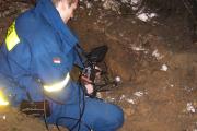 Da wir mit den vorhandenen Mitteln nicht die genaue Lage feststellen konnten, wurden die technischen Ortungsgeräte unseres Ortsverbandes nachalarmiert. Bis zum Eintreffen der Geräte gruben wir uns schon in die Richtung des Bellens. Mit der eingetroffenen Technik konnten wir dann die genaue Lage bestimmen. Unter Zuhilfenahme der SearchCam (ein „langer Stock mit schwenkbarerer Kamera“) konnten wir erkennen, dass Max nicht etwa eingeklemmt war, sondern dass er einfach nicht wieder heraus wollte, da Herr Fuchs auch noch zu Hause war. Durch einen beherzten Griff unseres Kameraden Klaus Kroll wurde Max dann aber wieder herausgeholt.